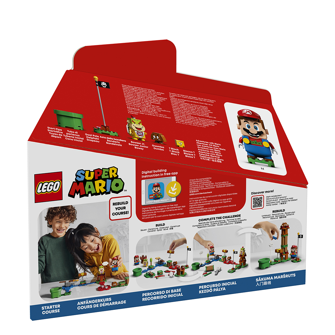 See how LEGO® Mario™ reacts in real life as you take on this LEGO® Super Mario™ Starter Course! Build your level and help Mario collect coins. Spin on the platform… but don’t fall off! Fly on the cloud. Get extra coins and a Super Star with the ? Block. Jump on the Goomba and stomp Bowser Jr. on the back to earn coins. Compete against friends and then rebuild to create new challenges!