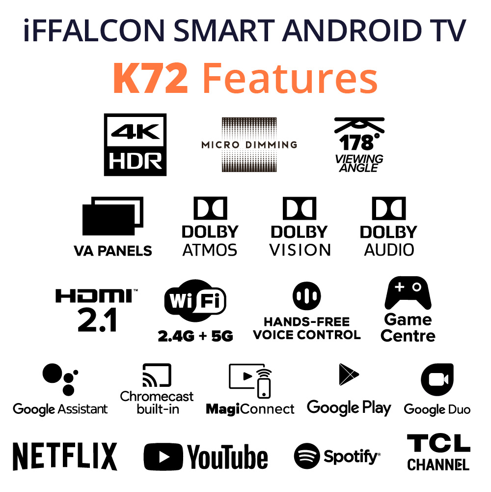 iFFALCON K72 4K QUHD Micro Dimming Smart TV 43 50 55 65 inch | Cinematic Dolby Vision Atmos Audio | HDMI 2.1 | MEMC | 5G Dual Wi-Fi | Hands-Free Voice Control 2.0 | AirPlay Google Play Store Youtube N
