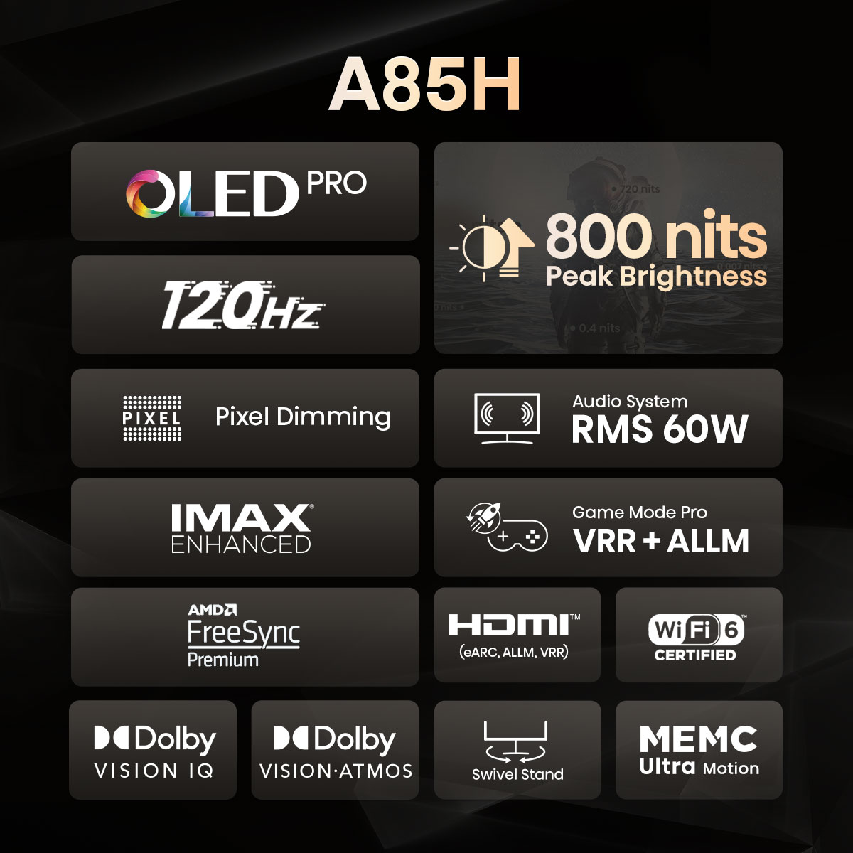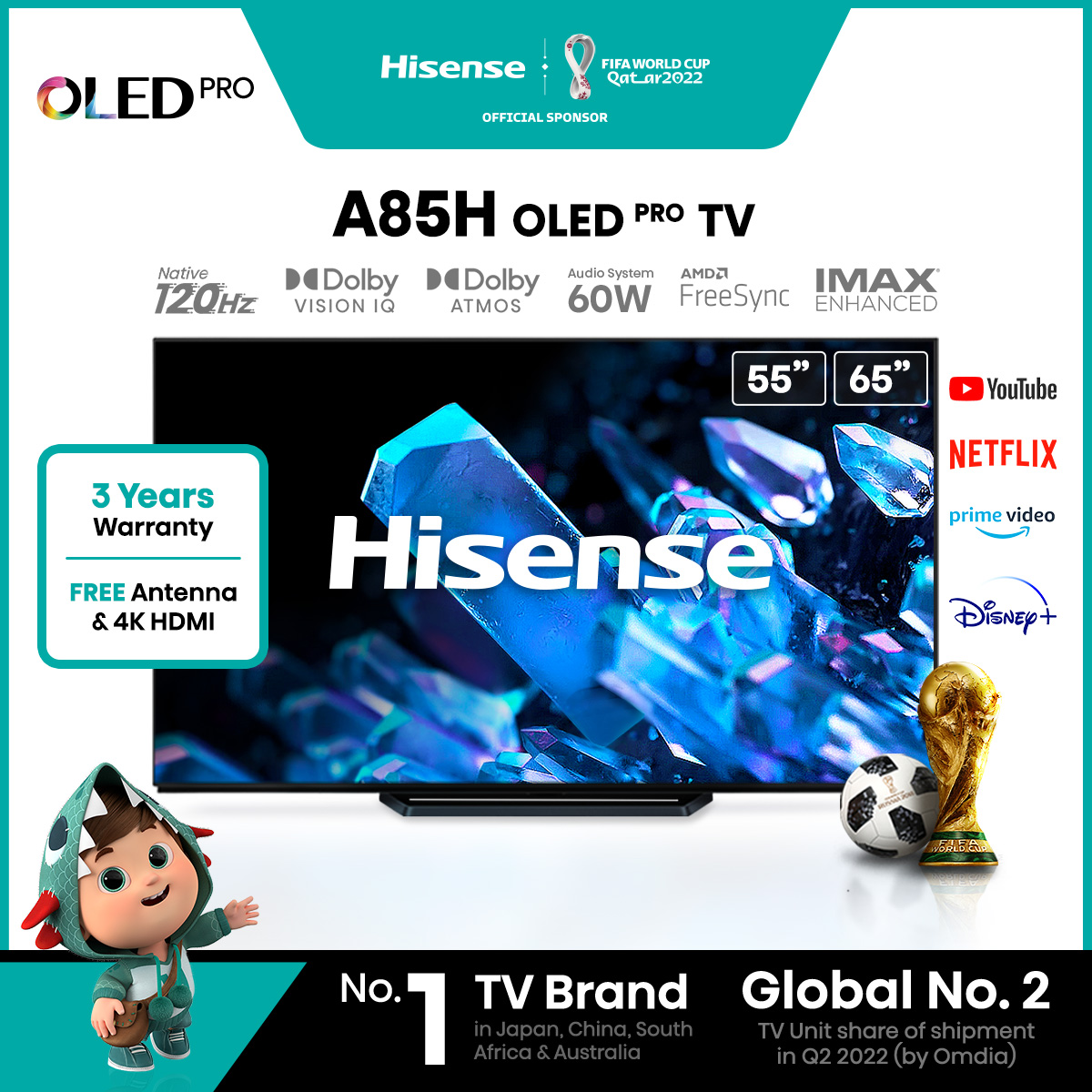 [2022] Hisense A85H 55" 65" OLED | 120Hz Refresh Rate | IMAX Enhanced | Dolby Vision IQ & Atmos | HDR 10+ | 800nits brightness | 60W audio system | HDMI 2.1 with eARC | Wifi 6 | MEMC | FreeSync VRR AL