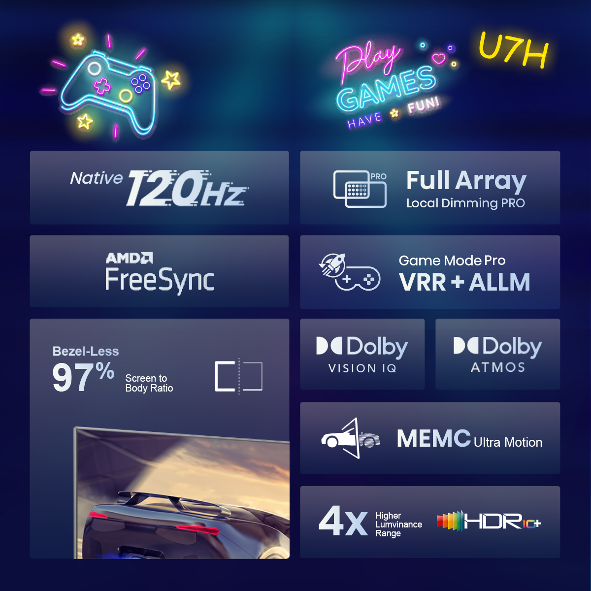 ?【Native 120Hz】 Support a smooth and real-time response ?【Full Array Local Dimming Pro】Ultra contrast for the most enhanced viewing experience ?【Dolby Vision & Atmos】Experience the most realistic holographic "surround" impact ?【HDR 10+】Highest brightness level of High Dynamic Range possible ?【MEMC】 Fast motion smoothing refresh rates ?【Game Mode Pro】AMD FreeSync Premium + Low Latency VRR+ALLM, experience no lag in FPS games ?【IMAX Enhanced】Deliver IMAX signature pictures to your home. Bring Cinema Home. ?【Filmmaker mode】One-click reset to the original picture and sound. ?【Airplay & Homekit】Wireless stream content or control from your Apple device to the TV (Coming Soon) ?【4K Upscaling】4K resolution powered by AI chips ?【Hi-View Image Engine】 64bit Quad Core ARM Cortex-A72 up to 1.7GHz ?【Smart TV】Pre-Programmed with Youtube, Netflix, Disney+ and other popular smart TV apps ?【Anyview Cast】Cast your phone or other smart devices' screen to TV ?【Voice command】Voice control your TV and smart home devices, a hands-free experience ?【Bluetooth remote】Longer distance 360° control compare to a traditional infrared controller ?【Wireless】Supports 2.4G and 5G dual wifi and Bluetooth 5.0 ?【Built-in ports】4 x HDMI 2.1 (1 x eARC), 1 x USB3.0, 1 x USB2.0, Ethernet (Lan)