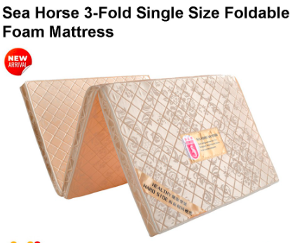 Product DetailThe Sea Horse Foldable Mattress is made of high density and ultimate hard foam layers to provide firm support for your backbone.*Moderate in hardness and softness, comfortable and delicate.* This is made from compress foam.*Foldable design into three layers allows easy and space-saving storage.*Adopt advanced mattress fabric, elegant, soft and comfortable. Anti-bacteria, Anti-fungal, Anti-dustmite